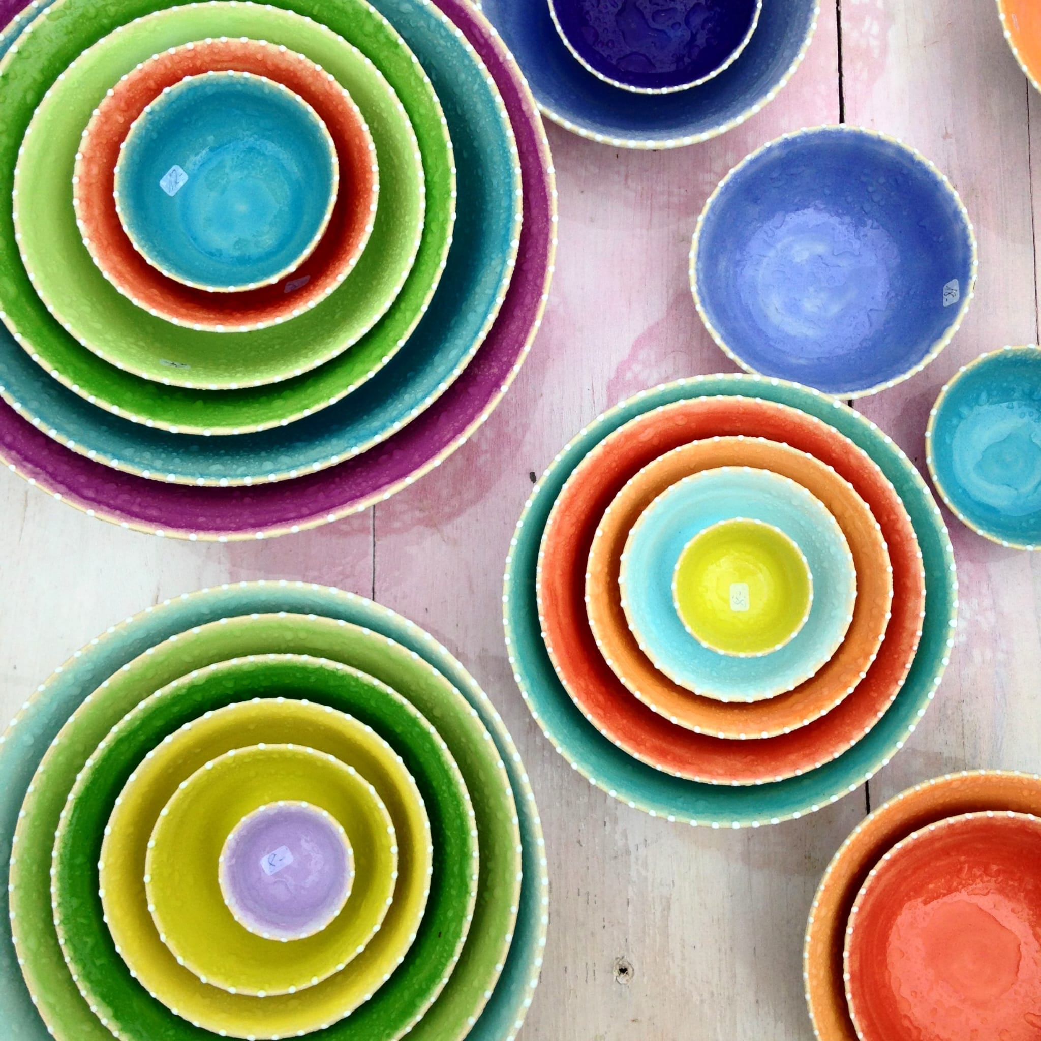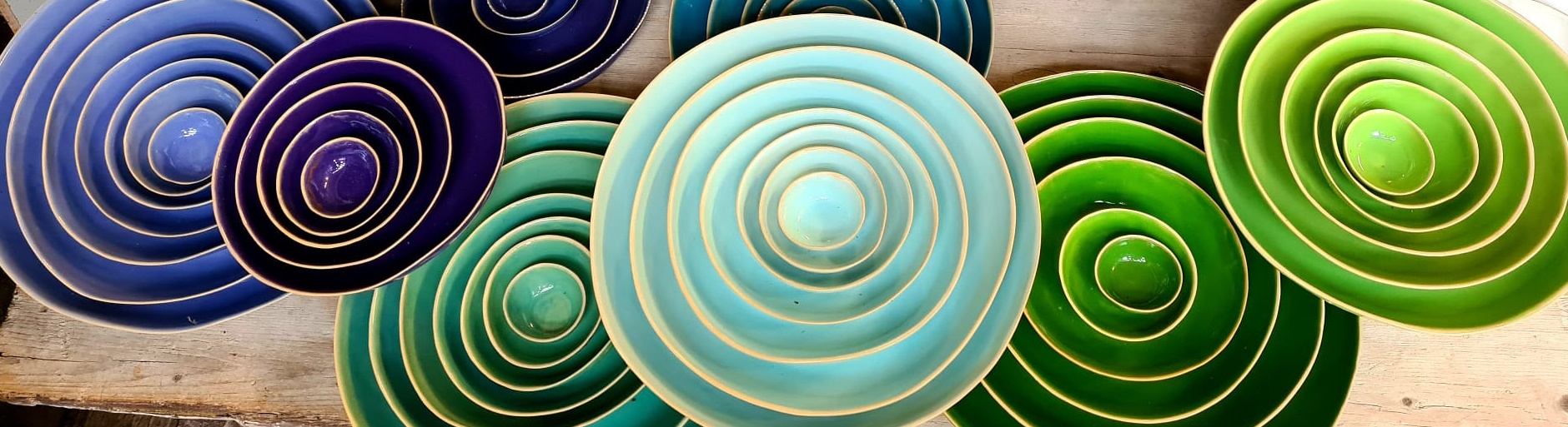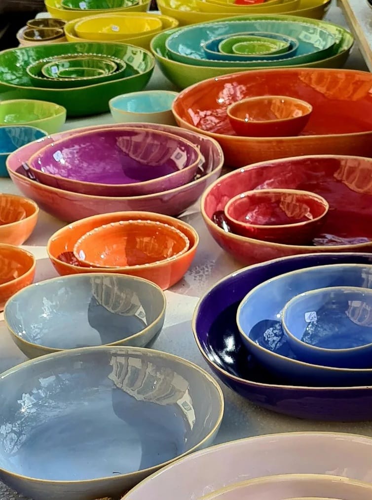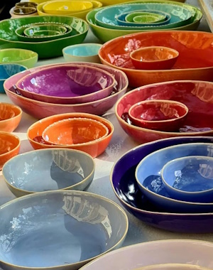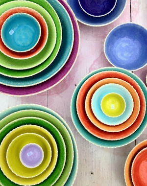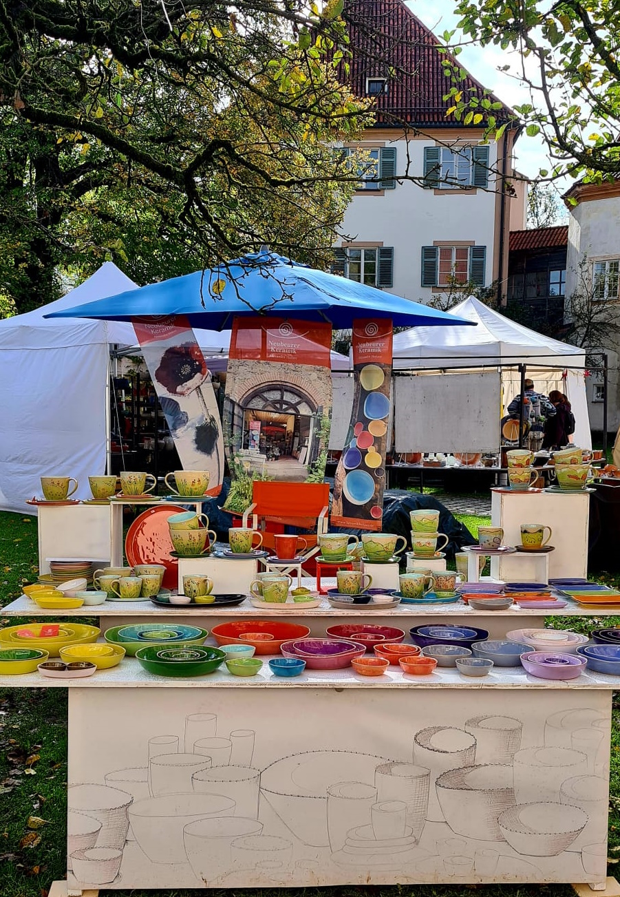 Farbenfrohes Gebrauchsgeschirr für alle Bedürfnisse, stapelbar und spülmaschinenfest. Frostfeste Gartenkeramik. Design und manuelle Herstellung von Alexandra Holzer und ihrem Team.