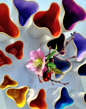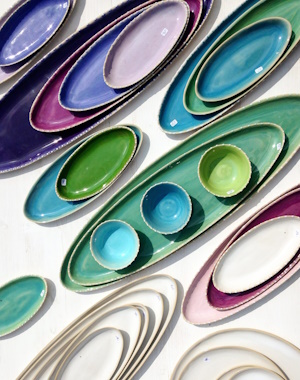 In Alexandra Holzers Werkstatt, die seit 2003 in einem romantischen Natursteingebäude in Neubeuern untergebracht ist, leuchten Teller, Servierplatten, Schalen und Tassen in maigrün, purpur, zitronengelb und meeresblau.